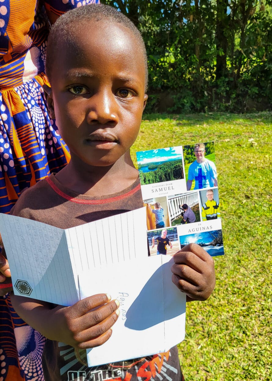 Samuel laittoi vanhempiensa matkaan mukaan kortin ja kirjoittamansa englanninkielisen kirjeen. Jalot antoivat sen kummilapselle Aquinasille ja Protas käänsi sen swahiliksi, jonka jälkeen otettiin videopuheluyhteys Suomeen, jotta myös Samuel pääsi juttelemaan kummilapsensa kanssa.